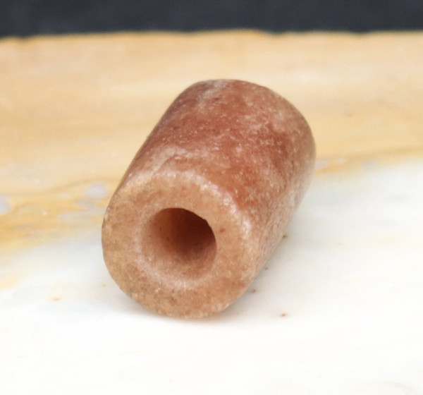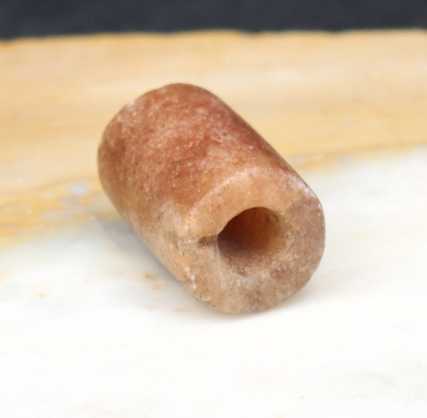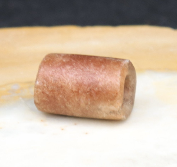 Perle antique (calcite rouge?) collectée au Mali. Trou biconique.