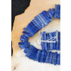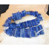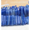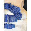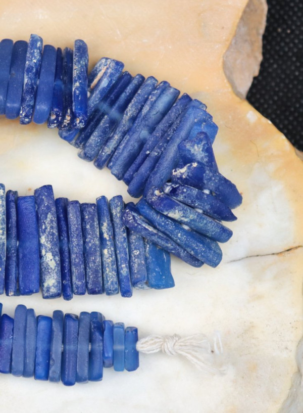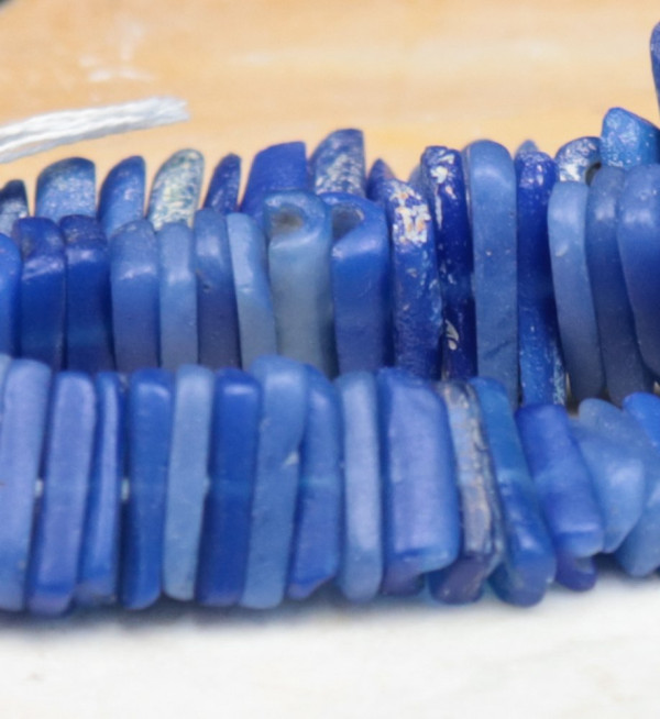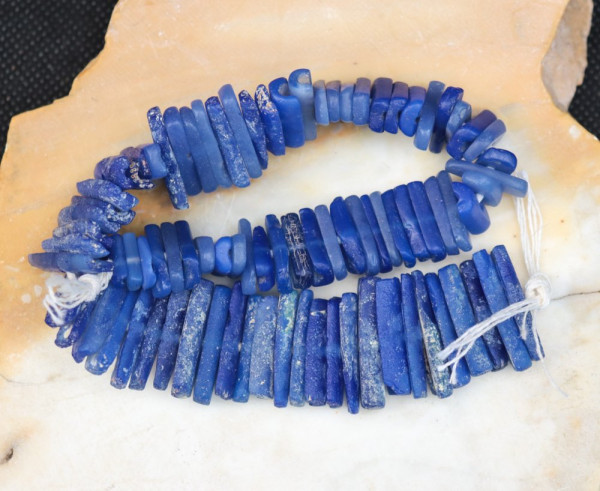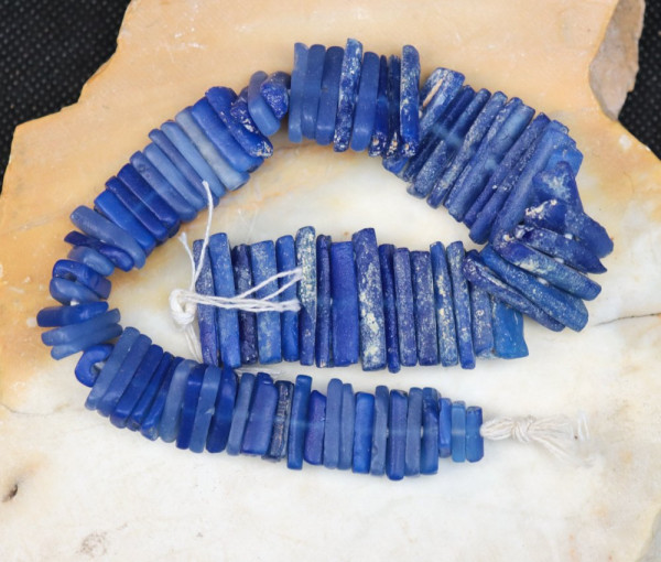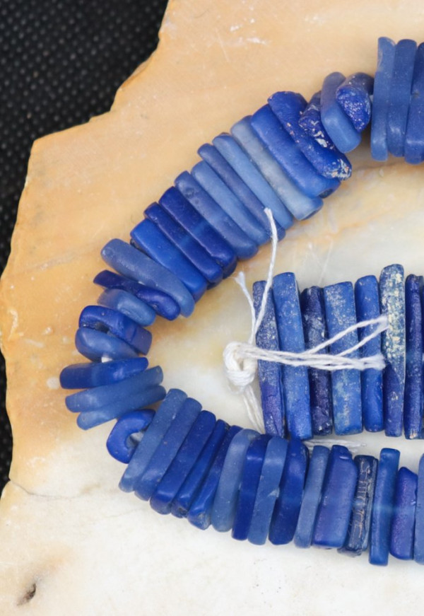 Très rares perles obtenues en ayant coupé en deux dans le sens de la longueur des perles cylindriques. Longueur du fil = 25cm; poids = 66g. Epaisseur = 2-4mm; longueur = 9-24mm.